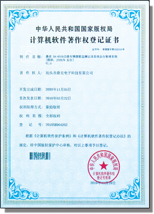 DA-931后平臺數(shù)據(jù)管理系統(tǒng)嚴(yán)格按照GA/T 497-2009《公路車輛智能監(jiān)測記錄系統(tǒng)通用技術(shù)條件》、《廣東省治安卡口視頻監(jiān)控系統(tǒng)建設(shè)規(guī)范》、GA/T 496–2009《闖紅燈自動記錄系統(tǒng)通用技術(shù)條件》等相關(guān)公共安全行業(yè)標(biāo)準(zhǔn),對整個系統(tǒng)建設(shè)進(jìn)行了詳細(xì)規(guī)劃設(shè)計(jì),充分體現(xiàn)出安全、實(shí)用、合理、易維護(hù)等特點(diǎn)。該系統(tǒng)已得到國家版權(quán)局計(jì)算機(jī)軟件著作登記權(quán)證書(軟著登字第0252535號)。