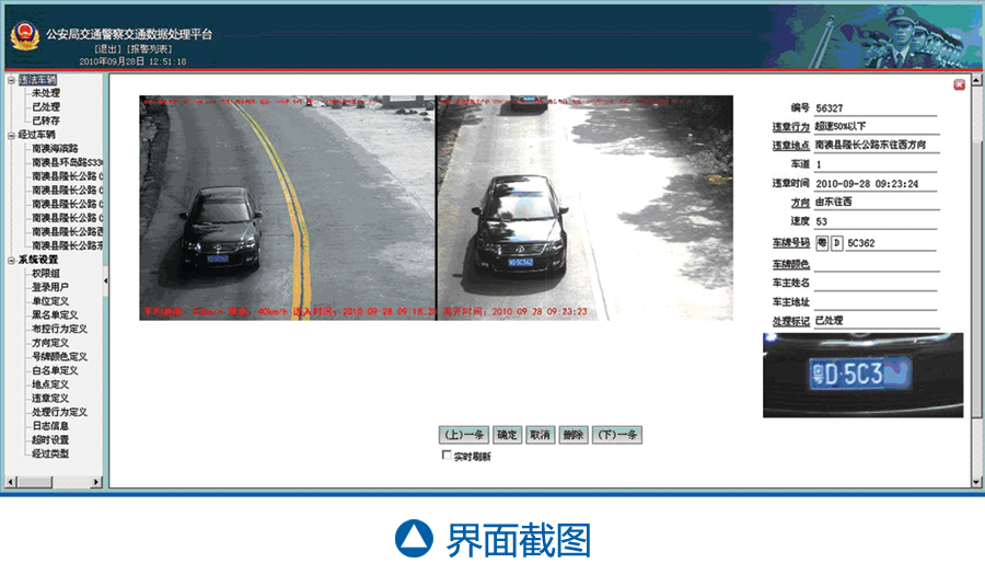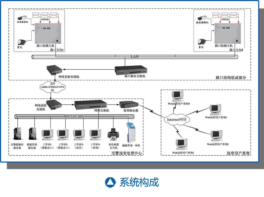DA-366公路車輛智能監(jiān)測(區(qū)間測速)自動記錄系統(tǒng)由二套及以上的前端系統(tǒng)構(gòu)建區(qū)間測速點(diǎn),準(zhǔn)確記錄通過車輛的時(shí)間及圖片,通過自動識別軟件提取車牌等相關(guān)信息,并將這些信息匯總到后臺服務(wù)器的數(shù)據(jù)庫處理。前端系統(tǒng)由車輛通過檢測單元、車輛通過監(jiān)控程序(儀表)、抓拍設(shè)備、主控程序、地感線圈組、閃光燈組件等部分組成。各個前端處理系統(tǒng)和后端系統(tǒng)以TCP/IP的方式組成局域網(wǎng),構(gòu)成完整的DA-356A區(qū)間測速自動記錄系統(tǒng)。前端采集到的車輛違法圖片被分類存儲在斷面服務(wù)器,圖片通過聯(lián)網(wǎng)將圖片傳送至后端系統(tǒng),完成車牌識別、入庫處理后,到達(dá)數(shù)據(jù)、控制中心,傳輸網(wǎng)絡(luò)可以是光纖、ADSL或其它有無線網(wǎng)絡(luò),并具備斷點(diǎn)續(xù)傳功能。